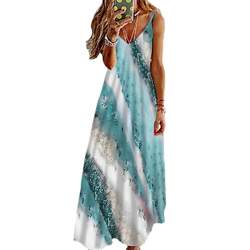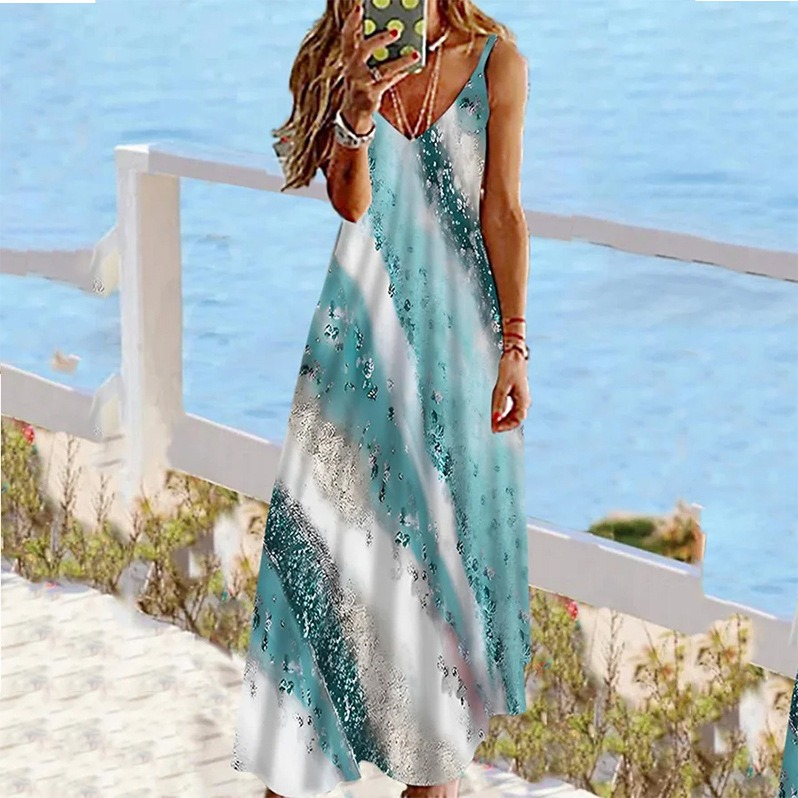 Crafted from high-quality polyester (polyester fiber), this dress features advanced 3D effect printing enhanced with sequin detailing for added glamour. The sling style with delicate shoulder straps and a V-shaped collar creates a flattering neckline, while the sleeveless cut keeps the look fresh and breathable for warmer days.