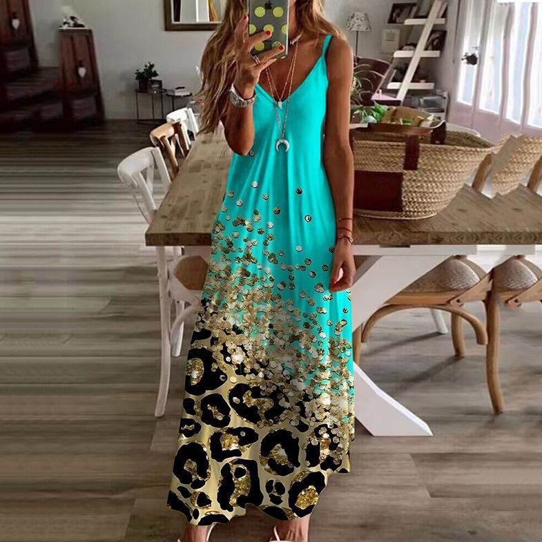 3D Leopard fashion Print Sequin A-Line Sling Loose Strap Maxi Dress