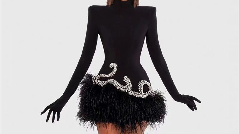 Step into luxury with the Black Diamond Fashionable Retro Banquet Performance Feather Mini Dress with Shoulder Pads. Featuring rhinestone details, feather skirt, and shoulder pads, it’s the perfect mix of bold and elegant for any formal or evening event.
