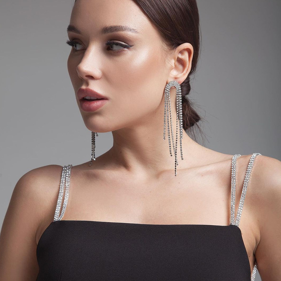 Designed for bold sophistication, this black bodycon evening dress blends sculpted elegance with striking metal rhinestone (strass) embellished chains detail, making it one of the most captivating party dresses for women this season.