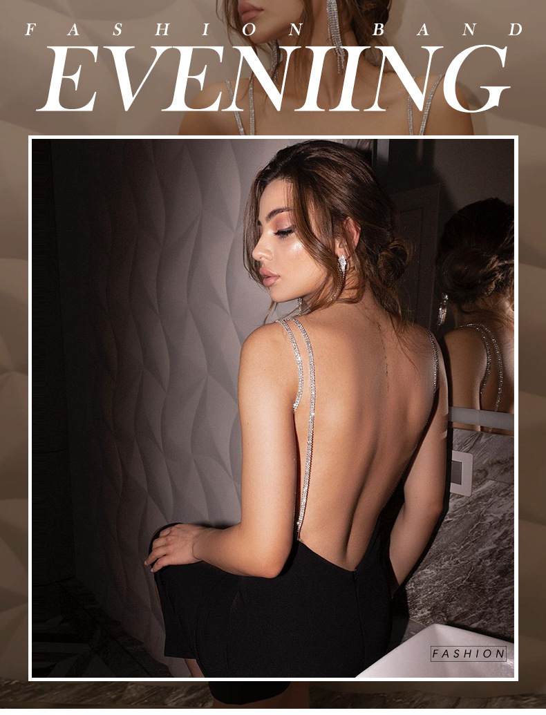 The Midnight Sparkle Open Back Bandage Sexy Prom Dress is a sleek black bodycon evening dress featuring a high waist, square neckline,  stunning metal rhinestone embellished chain straps,  open back design. Perfect for party dresses for women, prom nights, and elegant evening events.