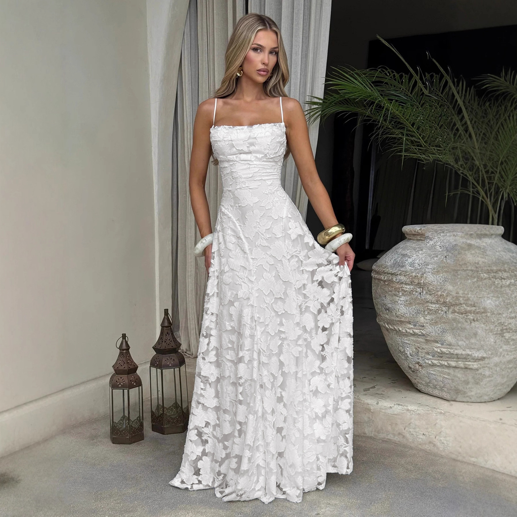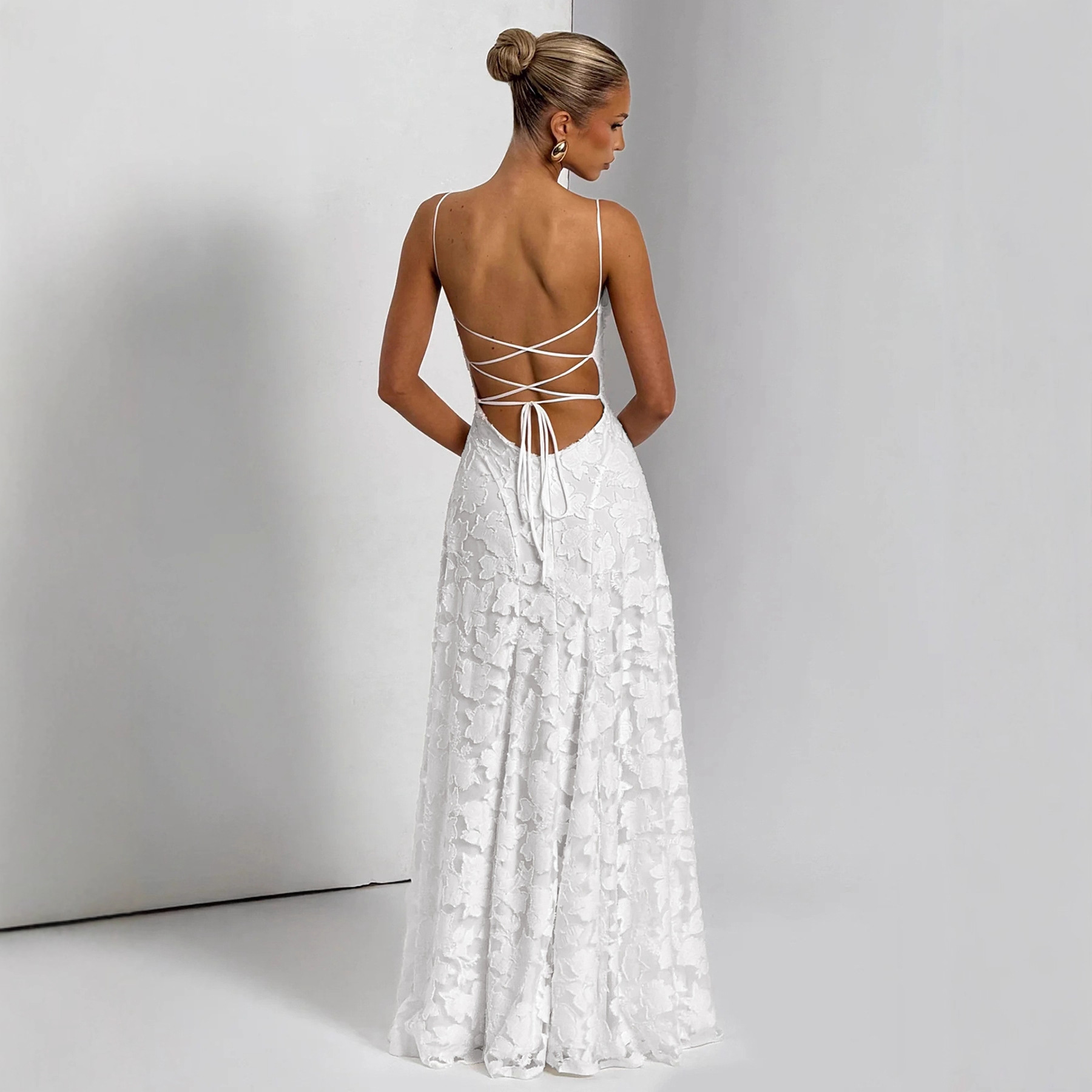 Design: Elegant backless, sleeveless A-line silhouette with jacquard floral pattern.