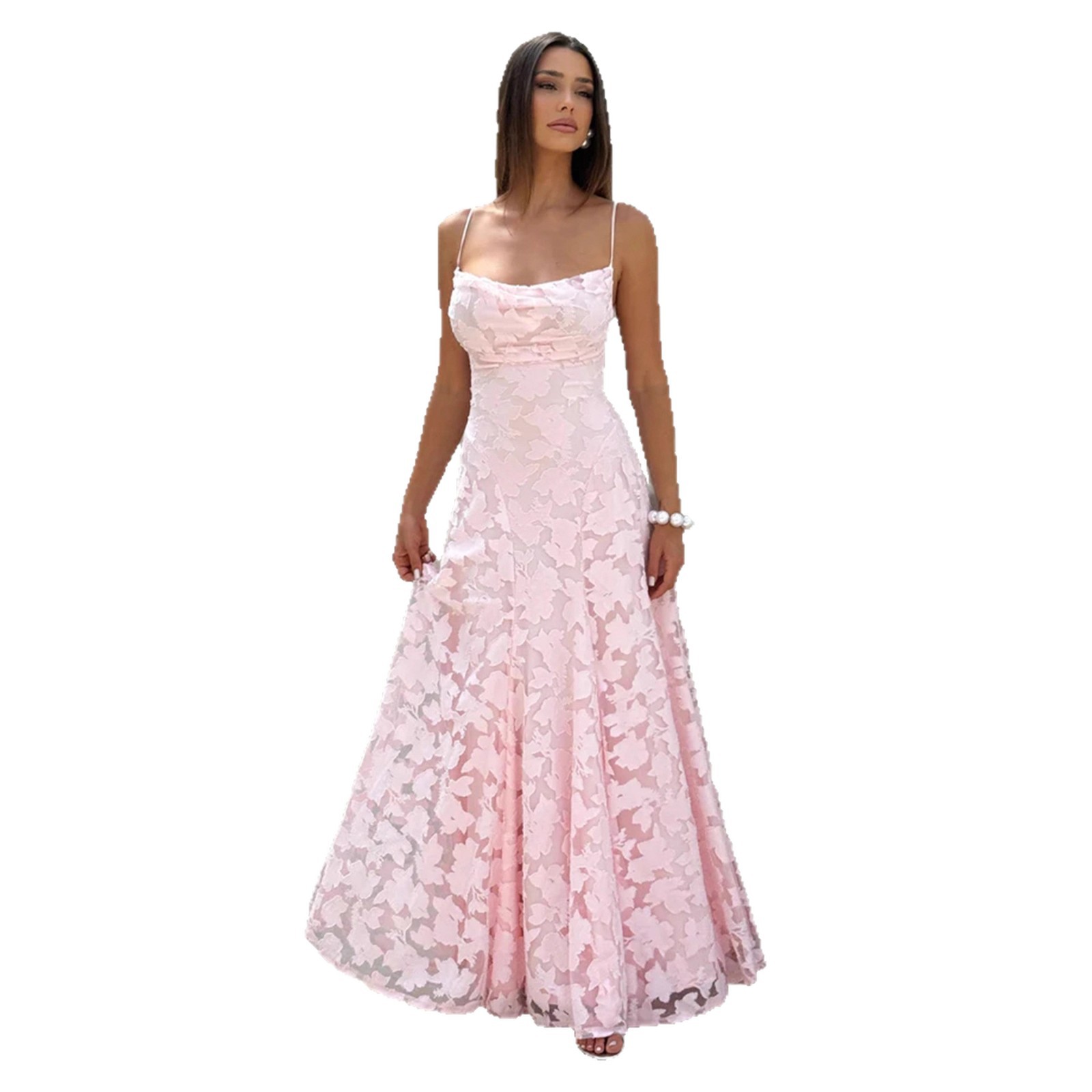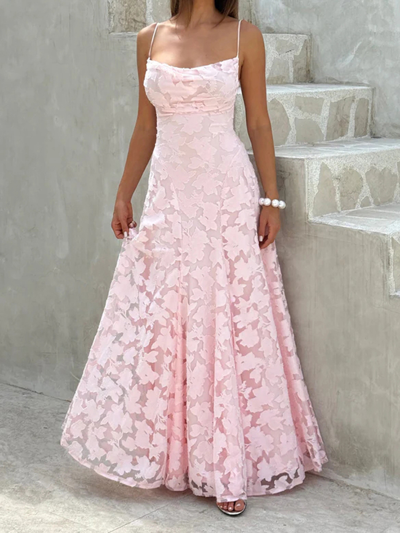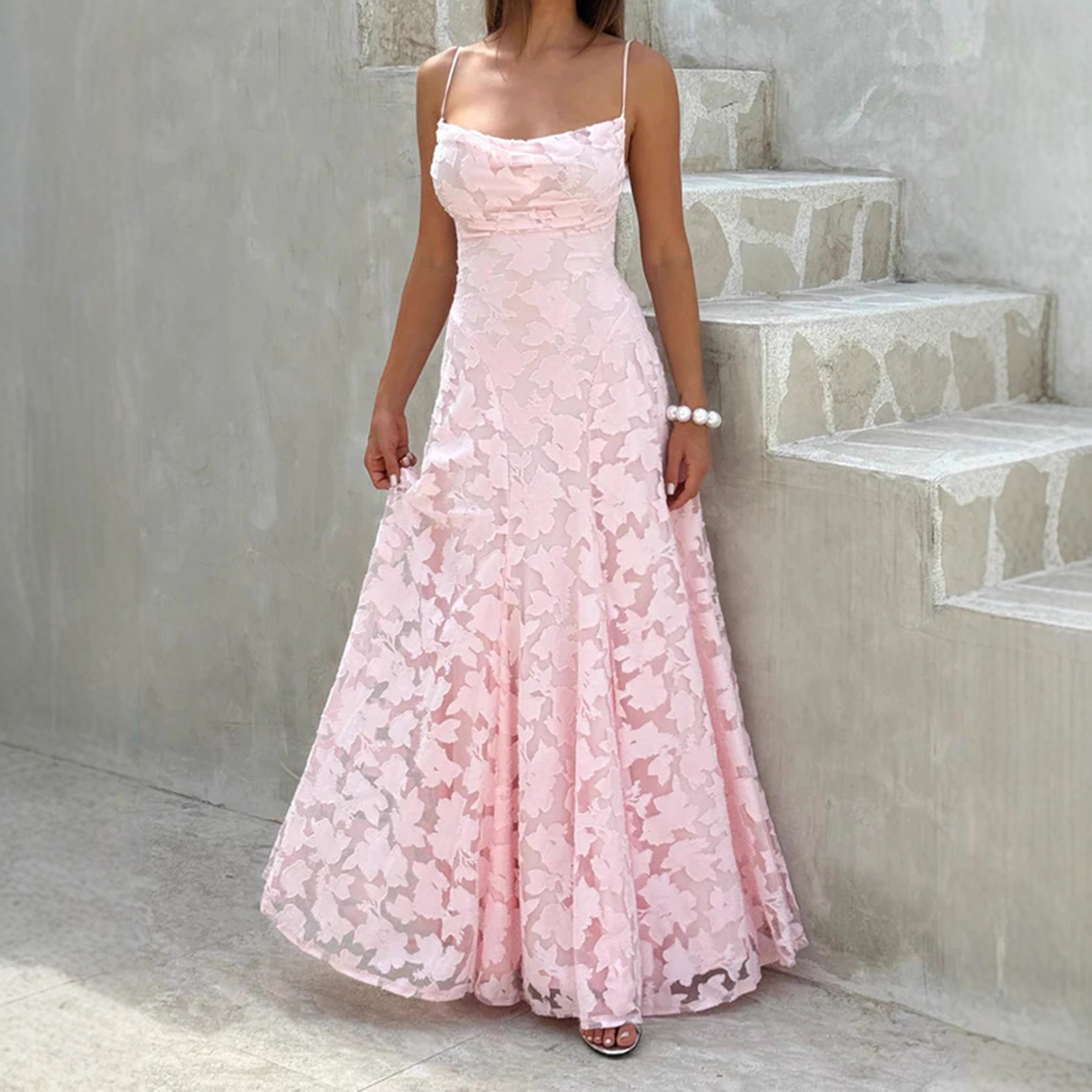 Crafted from high-quality polyester and spandex, this jacquard formal dress features a soft pink hue that flatters every skin tone. Its backless design, high waist, and A-line silhouette create a graceful flow that moves beautifully with every step. The intricate jacquard floral texture adds depth and sophistication, while the sleeveless neckline keeps the look modern and fresh.