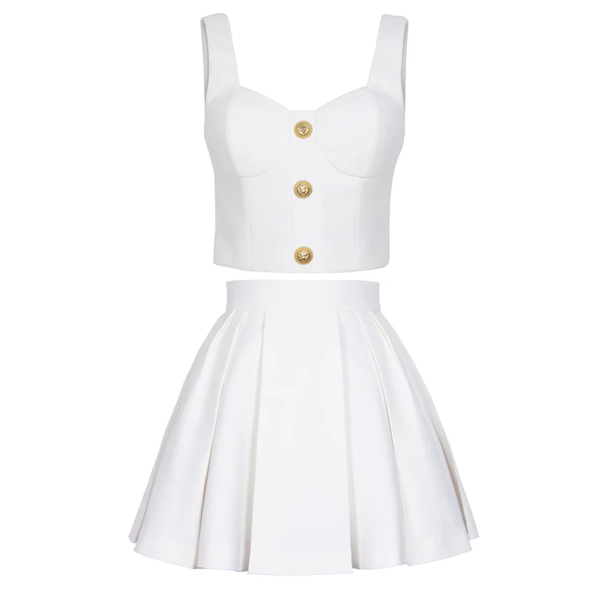 Luxurious gold button detailing for a glamorous, designer-inspired finish.