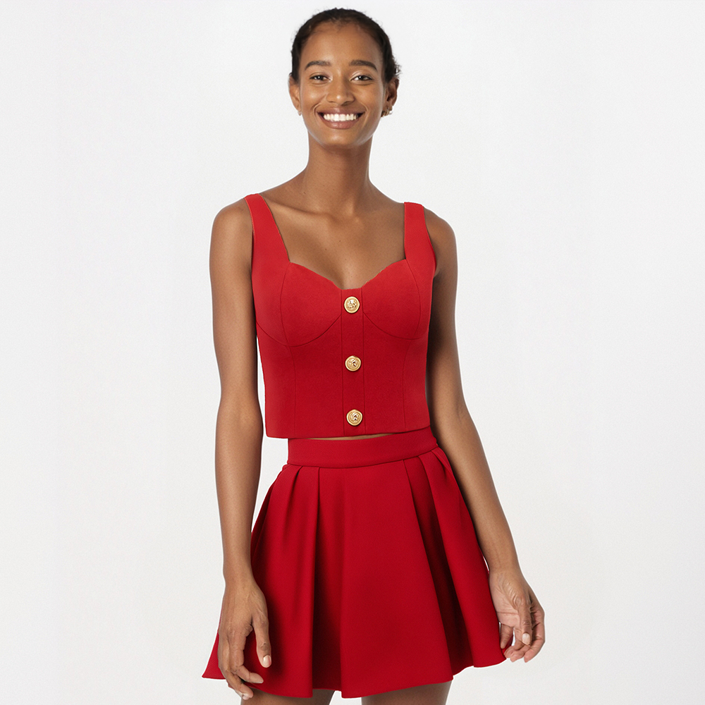 Turn every moment into a statement with the Glamorous Red Bandage Mini Dress with Gold Button Detail — a stunning piece designed for confident, fashion-forward women. Inspired by celebrity-style silhouettes, this socialite-style mini dress combines bold color, sculpted structure, and elegant accents. The sleek V-neck suspender design flatters the neckline, while the figure-hugging spandex blend enhances curves with a smooth, supportive fit.