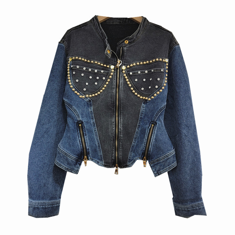 Studded Chic Elastic Slim Fit European Denim Jacket – Women’s Slim Fit Stand Collar Zip Top