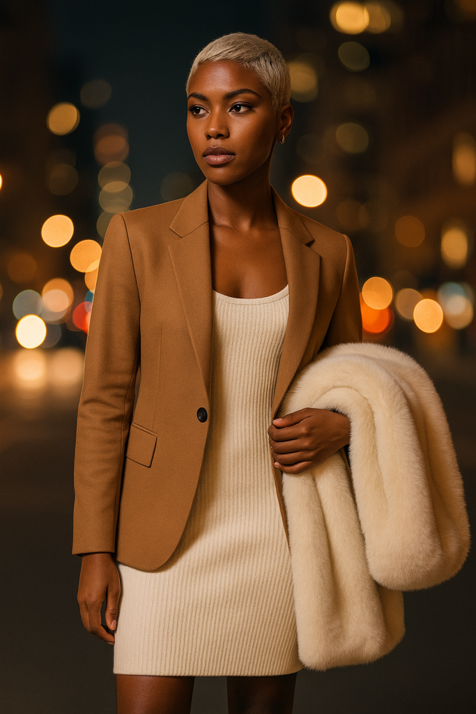 2025’s direction emphasizes contrast—smooth fabric against structured tailoring, voluminous skirts with fitted tops, faux leather with soft knits. Use the blazer over the knit dress, or the jacket with the knit vest. The mix keeps looks fresh.